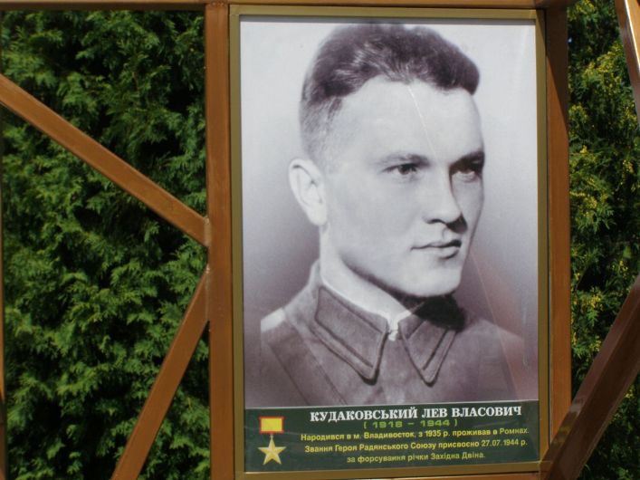 Командир батальона 992-го стрелкового полка (306-я стрелковая дивизия, 43-я армия, 1-й Прибалтийский фронт) майор Л.В.Кудаковский 24 июня 1944 года в числе первых переправился через реку Западная Двина у деревни Шарипино Бешенковичского района Витебской области (Белоруссия), затем организовал переправу батальона.