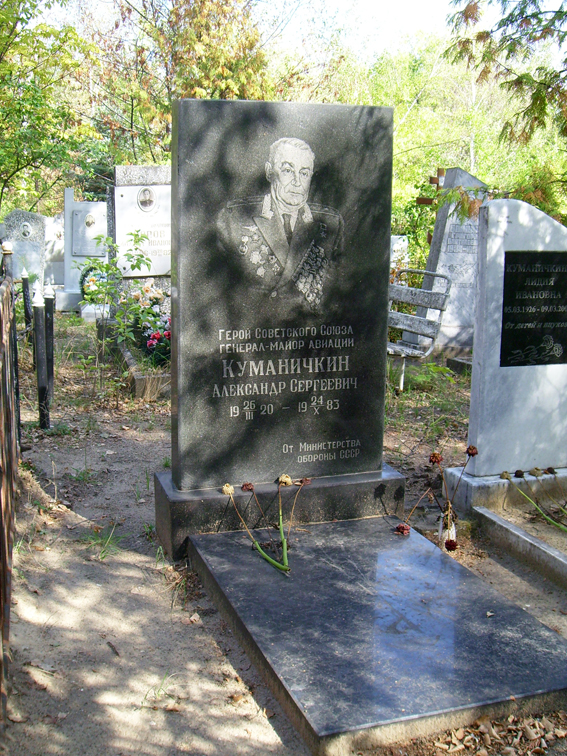 Куманичкин Александр Сергеевич - командир эскадрильи 41-го гвардейского Черновицкого ордена Кутузова истребительного авиационного полка 8-й гвардейской Киевской Краснознамённой орденов Суворова и Богдана Хмельницкого истребительной авиационной дивизии 5-го Львовского Краснознамённого истребительного авиационного корпуса 2-й воздушной армии 1-го Украинского фронта, гвардии капитан.