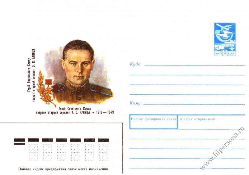 Куница Алексей Сергеевич – командир взвода 4-го гвардейского воздушно-десантного стрелкового полка (2-я гвардейская воздушно-десантная дивизия, 18-й гвардейский стрелковый корпус, 60-я армия, Центральный фронт), гвардии старший сержант.