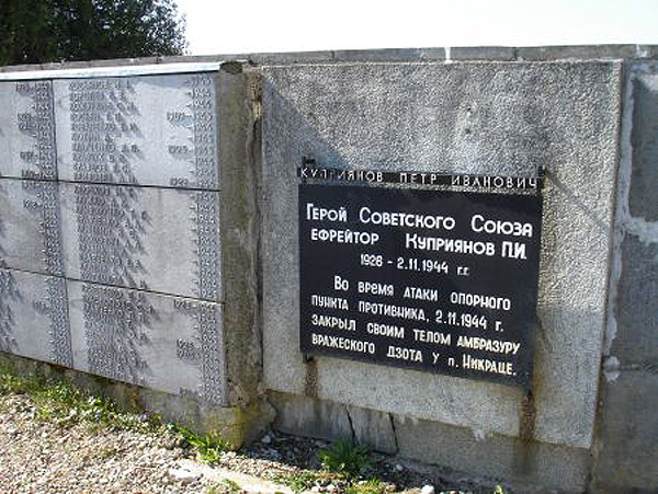 Недалеко от дзота в воронке притаился Пётр Куприянов. Внезапно он поднялся, добежал до дзота и упал грудью на амбразуру.