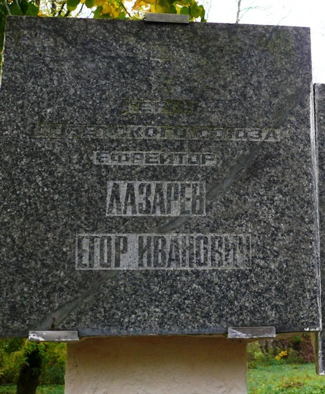14 октября 1943 года сержант Е.И. Лазарев погиб при выполнении боевого задания. Был похоронен на станции Янов возле одноименного села Чернобыльского района Киевской области, ныне находящегося в зоне отчуждения Чернобыльской АЭС.