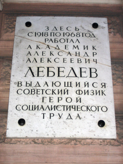 Установлена в Санкт-Петербурге на здании Государственного оптического института (Васильевский остров, Биржевая линия, д.14). Фото Алексея Пиголицына (г. Санкт-Петербург).