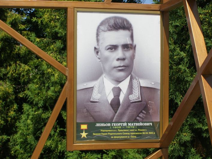 В городе Ромны Сумской области (Украина) на Аллее Героев установлен памятный стенд Г.М.Ленёва.