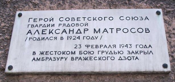 23 февраля 1943 года гвардии рядовой 254-го гвардейского стрелкового полка 56-й гвардейской стрелковой дивизии Александр Матвеевич Матросов в решающую минуту боя с немецко-фашистскими захватчиками за дер. Чернушки, прорвавшись к вражескому ДЗОТу, закрыл своим телом амбразуру, пожертвовал собой и тем обеспечил успех наступающего подразделения.