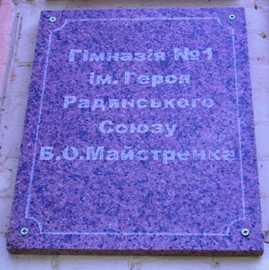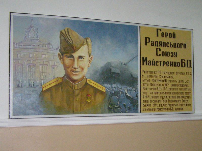 Новгород-Северская школа № 1 имени Героя Советского Союза Бориса Александровича Майстренко. При входе — портрет танкиста с юным мужественным лицом.
