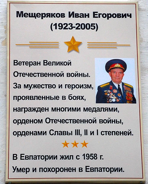 *Иногда местами рождения И. Е. Мещерякова ошибочно указывают села Громово и Внуково Черноморского района. **Наименование военкомата призыва весной 1944 года во всех наградных листах разное (Ак-Мечетский. Долончарский, Дауджарский, однако районов с двумя последними названиями в Крыму не существовало, то есть налицо явные ошибки). ***Причиной тому стало то, что в связи с переводом в другую часть в наградном листе отсутствовали сведения о награждении орденом Славы 2-й степени от 18 февраля 1945 года, и сам И. Е. Мещеряков о нём не знал.