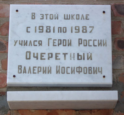 Мемориальная доска в честь В.И. Очеретного, установленная на здании средней общеобразовательной школы № 3 г. Курганинска Краснодарского края взамен первоначальной. Фото Владимира Рогова, 2012 г.