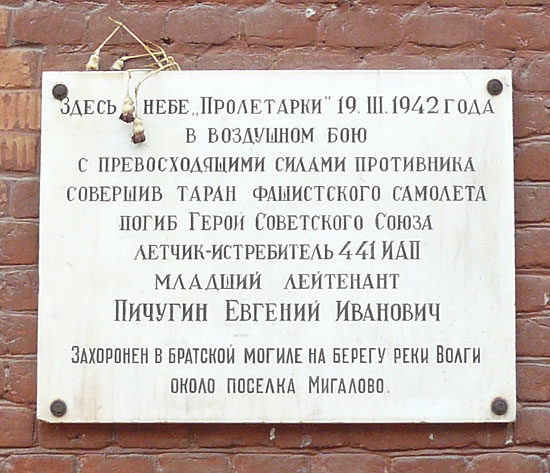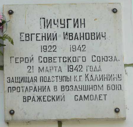 12 января 1942 года полк перебазировался на аэродром Мигалово в районе Калинина (Тверь). 19 марта комсомолец младший лейтенант Пичугин Е.И. дежурил на аэродроме. Около 10 часов он вылетел по сигналу тревоги на перехват самолётов противника, направлявшихся к Калинину. В воздухе он обнаружил группу из 8 бомбардировщиков Ju-88 и 4 истребителей Me-109. Зайдя со стороны солнца, Пичугин пошёл в атаку на бомбардировщиков и сбил один "юнкерс". Остальные сбросили бомбы и повернули назад. Когда они поняли, что их атакует всего один самолёт, сомкнули строй и открыли огонь. В это время на него набросились "мессершмитты". Завязался неравный бой. В ходе боя Пичугин оказался в хвосте одного из них. Он нажал на гашетку, но выстрелов не последовало. Тогда он подошёл вплотную и нанёс удар винтом по хвостовому оперению и фюзеляжу. Сам выбросился с парашютом, но один из фашистов расстрелял его в воздухе.