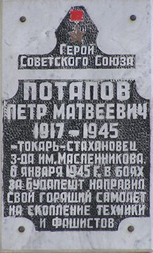Потапов Пётр Матвеевич - заместитель командира эскадрильи 873-го штурмового авиационного полка 231-й штурмовой авиационной дивизии 5-й воздушной армии 2-го Украинского фронта, старший лейтенант.