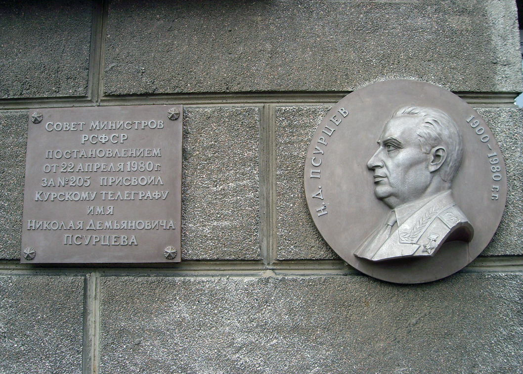 Установлены в Курске (Красная площадь, дом 8) на здании Курского телеграфа, носящего имя Н.Д.Псурцева. Фото А.А.Симонова, 12.10.2008.