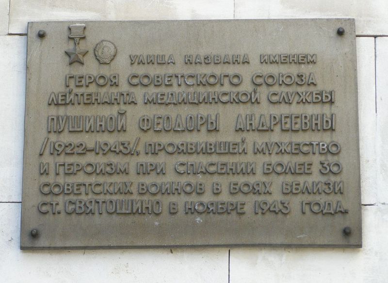 Военфельдшер 520-го стрелкового полка (167-я стрелковая дивизия, 38-я армия, 1-й Украинский фронт) комсомолка лейтенант медицинской службы Пушина Ф.А. проявила мужество и самоотверженность при спасении раненых.