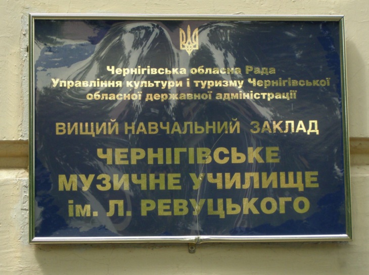 Установлена на здании Черниговского музыкального училища имени Л.Н.Ревуцкого (улица Шевченко, 6). Фото Олега Кожухаря, май 2010.