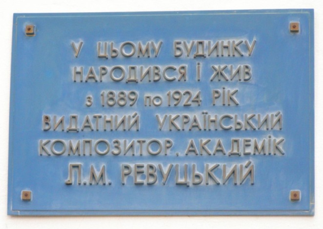 Установлена в Киеве (Украина) на доме (улица Софийская, 16), в котором в 1956-1977 годах жил и работал Л.Н.Ревуцкий. Фото Игоря Сердюкова, 9.03.2009.