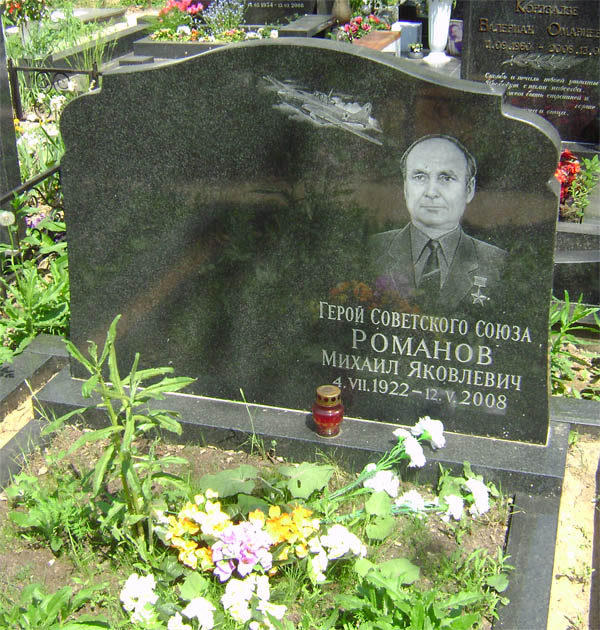 Романов Михаил Яковлевич - командир 3-й эскадрильи 565-го штурмового авиационного Станиславского полка (224-я штурмовая авиационная Жмеринская Краснознаменная дивизия, 8-й штурмовой авиационный корпус, 8-я воздушная армия, 4-й Украинский фронт), старший лейтенант.
