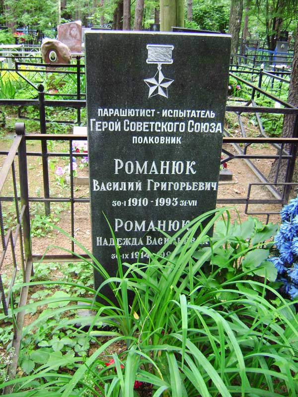 Романюк Василий Григорьевич – заместитель начальника отделения по лётным испытаниям и парашютной подготовке – старший инструктор-испытатель парашютов и катапультных установок Научно-исследовательского института ВВС СССР, полковник; первый среди парашютистов-испытателей, удостоенный звания Героя Советского Союза.
