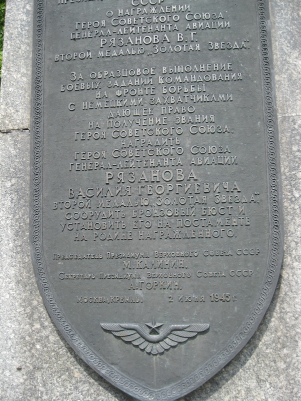 За отличия в боях на рубеже реки Висла и при разгроме ченстоховско-радомской группировки противника гвардии генерал-лейтенант авиации Рязанов Василий Георгиевич Указом Президиума Верховного Совета СССР от 2 июня 1945 года награждён второй медалью «Золотая Звезда».