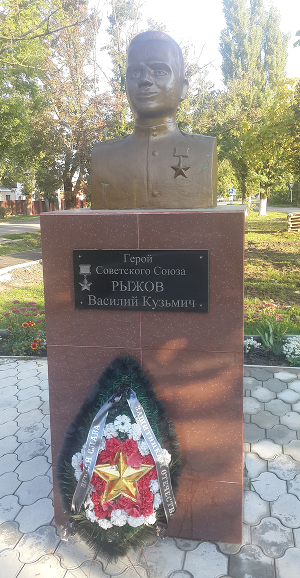 *Имеются и другие сведения о начале боевой деятельности В.К.Рыжова. По утверждению сына Героя Сергея Васильевича Рыжова (ссылку см. ниже), его отец в 1942 году добровольно в возрасте 17 лет был призван в Красную армию, воевал на Кубани, попал в окружение и, чудом избежав гибели, воевал в партизанском отряде. При первой возможности перешел линию фронта, снова вступив в ряды армии.