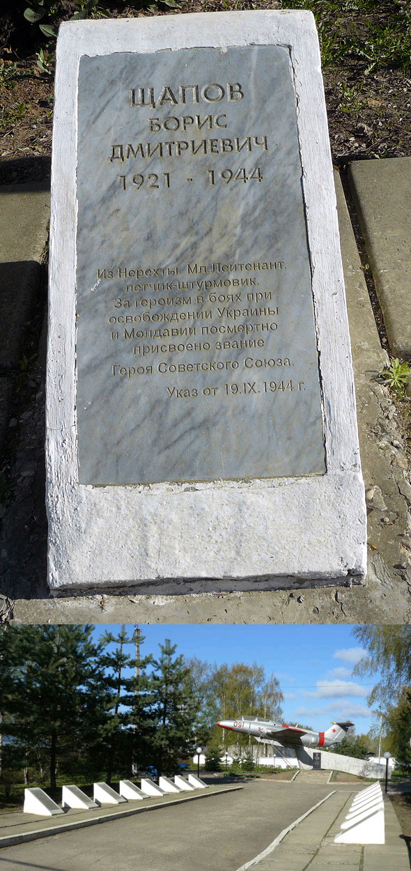 Щапов Борис Дмитриевич - старший лётчик 144-го гвардейского штурмового авиационного полка 9-й гвардейской Красногорской штурмовой авиационной дивизии 1-го гвардейского Кировоградского штурмового авиационного корпуса 5-й воздушной армии 2-го Украинского фронта, гвардии младший лейтенант.