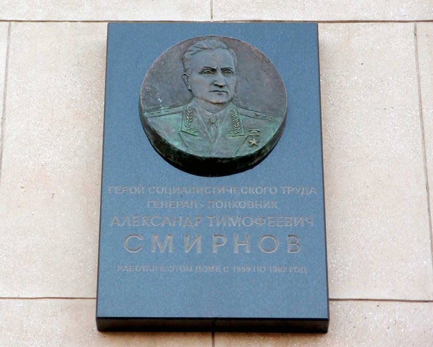 Установлена в Москве (Фрунзенская набережная. дом 22/2) на здании, в котором в 1959-1982 годах работал А.Т.Смирнов. Фото Станислава Лебедева, 30.04.2013.
