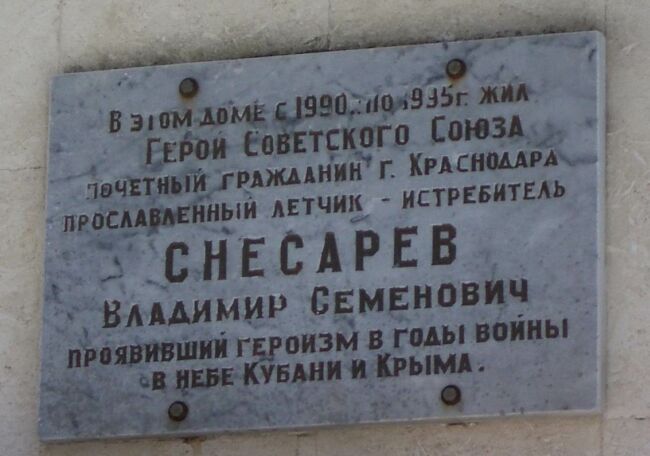 Командир эскадрильи 11-го гвардейского истребительного авиационного полка (1-я минно-торпедная авиационная дивизия, ВВС Черноморского флота) кандидат в члены ВКП(б) гвардии старший лейтенант Владимир Снесарёв к апрелю 1944 года совершил 302 боевых вылета, в 32 воздушных боях сбил лично 12 и в группе 4 вражеских самолета.