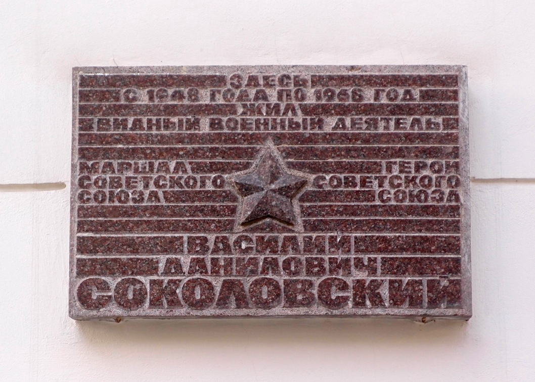 В Великую Отечественную войну генерал Соколовский В.Д. - начальник штаба Западного фронта (21.07.1941-25.01.1942 и 5.05.1942-28.02.1943); начальник штаба Западного направления (30.07.1941-10.09.1941 и 1.02.1942-5.05.1942); командующий войсками Западного фронта (28.02.1943-15.04.1944); начальник штаба 1-го Украинского фронта (15.04.1944-9.04.1945); заместитель командующего 1-м Белорусским фронтом (9.04.1945-10.06.1945).