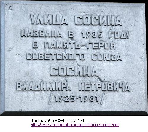 В городе Саров именем В.П.Сосина названа улица (1985); на ней установлена мемориальная доска. В центре города Кольчугино на мемориале в центре города среди семи Героев Советского Союза – кольчугинцев имеется стела в честь В.П.Сосина. Мемориальная доска Герою установлена в городе Орехово-Зуево Московской области.