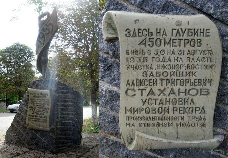 Памятник творцам стахановского движения установлен в 2010 году в городе Ирмино Стахановского городского совета Луганской области (Украина). Авторы — группа луганских скульпторов: Николай Можаев, Александр Редькин, Виктор Закалюкин, Вячеслав Шаповалов и Роман Мануйлов. Фото Олега и Елены Кныш, 2013.