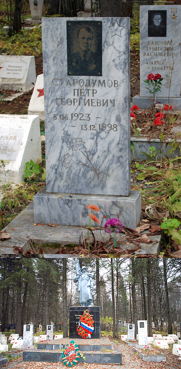 Стародумов Пётр Георгиевич - командир отделения взвода пешей разведки 823-го стрелкового полка (302-я стрелковая дивизия, 60-я армия, 4-й Украинский фронт), сержант – на момент представления к награждению орденом Славы 1-й степени.