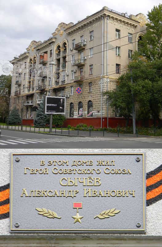 Командир 329-го отдельного инженерного батальона (7-я гвардейская армия, Степной фронт) майор Александр Сычёв при форсировании реки Днепр 25 сентября 1943 года у села Бородаевка Верхнеднепровского района Днепропетровской области Украины обеспечил переправу десанта на подручных средствах и захваченных у гитлеровцев рыбацких лодках.