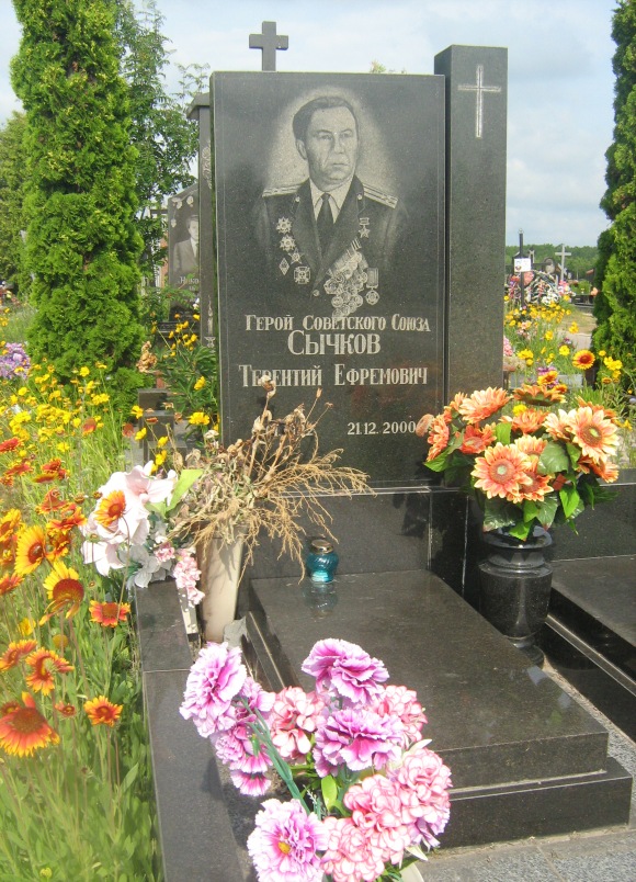Указом Президиума Верховного Совета СССР от 3 июня 1944 года за мужество, отвагу и героизм, проявленные в борьбе с немецко-фашистскими захватчиками, старшему лейтенанту Сычкову Терентию Ефремовичу присвоено звание Героя Советского Союза с вручением ордена Ленина и медали «Золотая Звезда» (№ 4349).