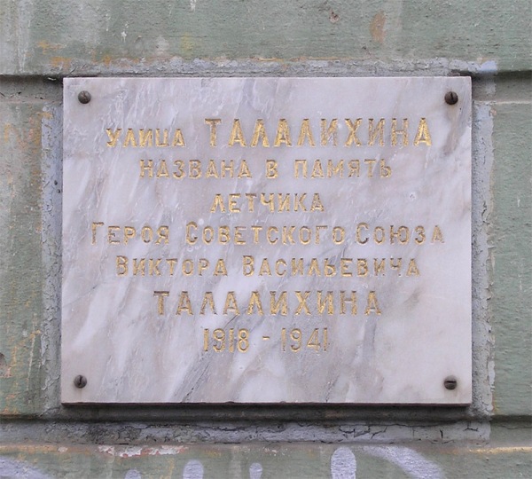В Москве и в Подольске установлены памятники Герою. На 43-м километре Варшавского шоссе, над которым произошел беспримерный ночной поединок, установлен обелиск. Именем В. Талалихина названы улицы в Москве, Калининграде, Волгограде, Красноярске, Владивостоке, Борисоглебске Воронежской области и других городах, морское судно, ГПТУ № 100 в Москве, ряд школ. Мемориальная доска установлена на памятной стеле напротив здания средней школы № 1 в городе Вольск Саратовской области.