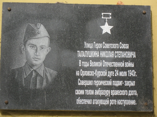 27 июля 1943 года полк наступал на деревню Мокрые Верхи (ныне Хвастовичский район Калужской области) Орловской области. Продвижению батальона препятствовал огонь дзотов. Пять бойцов, среди которых был красноармеец Талалушкин, вооружившись гранатами, поползли к вражеским дзотам. До рубежа живым добрался один Талалушкин. Он метнул гранаты и заставил замолчать дзот, рота поднялась в атаку, но была прижата к земле огнем из другого дзота. Гранат больше не было, и тогда красноармеец вплотную подполз к дзоту, стремительно вскочил и закрыл амбразуру своим телом. Путь атакующей роте был открыт.
