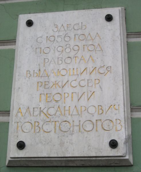 Мемориальная доска в Санкт-Петербурге на здании Большого драматического театра, где в 1956-1989 годах работал Г.А.Товстоногов (Набережная реки Фонтанки, 65). Открыта в 1993 году. Архитекторы В.С.Васильковский, М.Т.Литовченко. Фото А.В.Пиголицына (Санкт-Петербург), 2011.