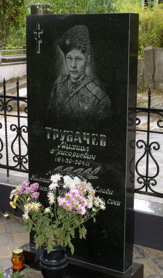 Трубачёв Михаил Григорьевич ‒ помощник командира взвода разведки 50-го гвардейского кавалерийского полка 13-й гвардейской кавалерийской дивизии конно-механизированной группы 2-го Украинского фронта, гвардии старший сержант ‒ на момент представления к награждению орденом Славы 1-й степени.