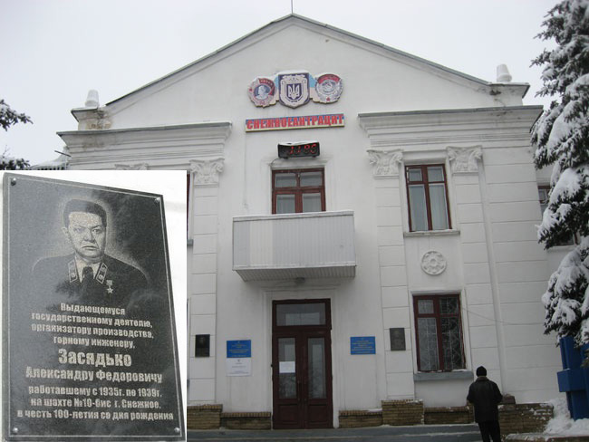 Установлена на здании управления предприятия"Снежноеантрацит" (улица Ленина, 32) в городе Снежное Донецкой области (Украина). Фото Олега и Елены Кныш.